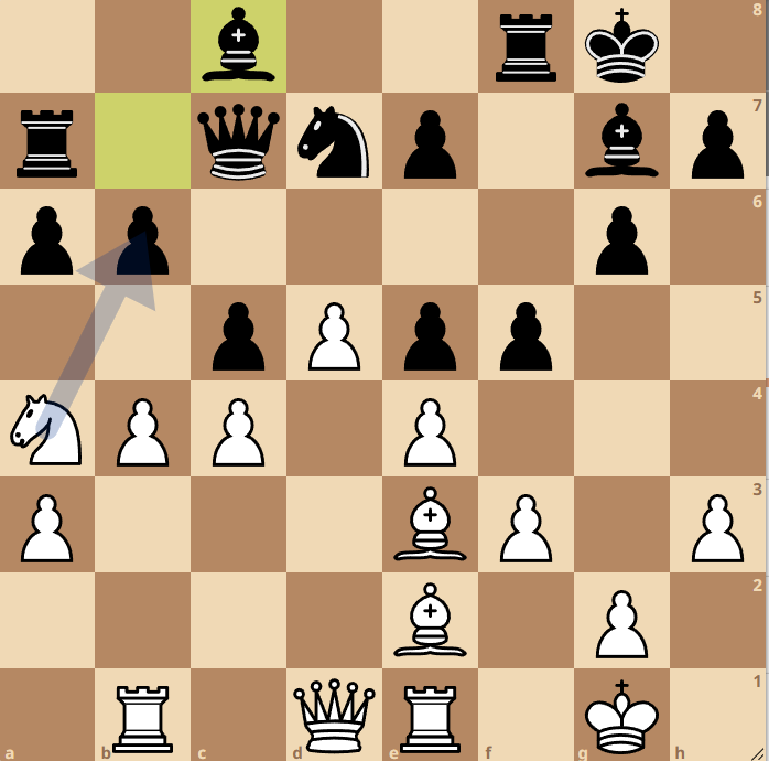 Hier vond Dejen de zet 20. Pxb6!! Na 20…Pxb6 21.bxc5 Pd7 22.c6 wint wit het geofferde