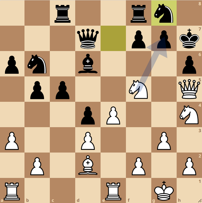 alle varianten (veel) materiaal of gaat mat. De partij eindigde met 23. Pxg7 Kxg7 24. Pf5+ Kh7 25.