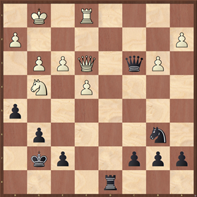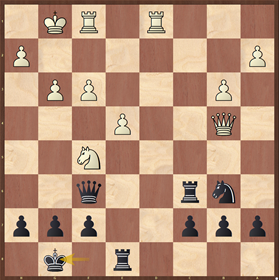 Martin kwam in een variant die hij al veel te lang niet meer gezien had. Met als gevolg zetten door elkaar halen, en een veel te optimistische breekzet. Wit had hier meteen van kunnen profiteren, zo bleek achteraf, maar deed dat niet. Daarna volgde een fase waarin zwart voortdurend gelijk leek te maken, maar toch net niet helemaal. Het uitzoeken hoe ik onder die druk vandaan kon komen, kostte mij helaas teveel tijd. Uiteindelijk kwam ik er redelijk uit, maar in onderstaande stelling gaf ik wit alsnog een kans om de partij meteen te beslissen: