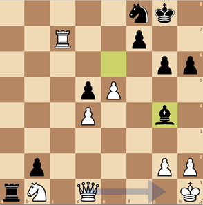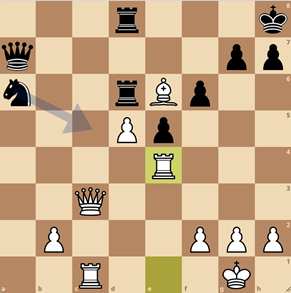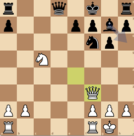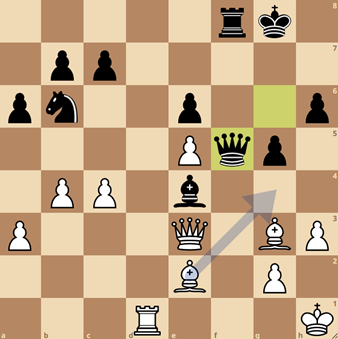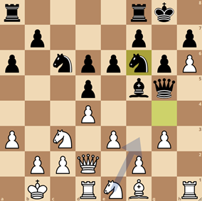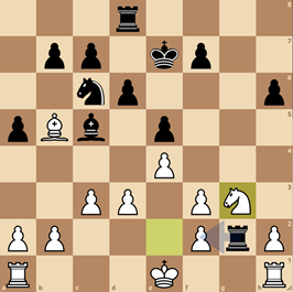 Obaida heeft net 16.Pg3 gespeeld, en dan is de vraag: kan zwart op f2 slaan? 16…Lxf2 faalt op 17.Kf1, dus 16…Txf2 werd gespeeld en nu speelde Obaida 17.d4?! Lijkt logisch, om de zwarte toren op te sluiten – en het werkte goed, want zijn tegenstander vervolgde met 17…exd4 en na 18. Kxf2 dxc3+ 19. Ke1 cxb2 20. Tb1 stond wit duidelijk beter. De partij was snel daarna afgelopen, want zwart probeerde zijn trots, de b2 pion te verdedigen met 20..Ld4, maar toen besliste Obaida met 21. Lxc6! Bxc6 22. Pf5+ met een dubbele aanval de partij, waarna zijn tegenstander zich met een les rijker en een illusie armer zich gedwongen voelde om de handdoek in de ring te gooien.