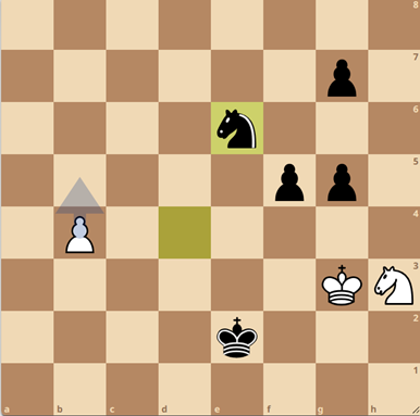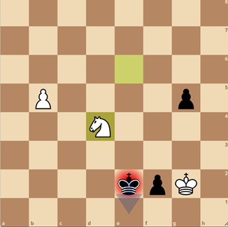 Maarten heeft hier zojuist 54…Pe6? gespeeld. Na 54…g4 staat hij absoluut winnend, maar nu heeft Ziyang een kans: 55. Pxg5! en zwart kan niet goed terugslaan, want dan loopt de witte b-pion door (direct 55.b5 was ook genoeg voor remise). Er volgde 55…f4+ 56. Kg4 Ke3?? en dit is een volstrekt onverantwoorde manier om nog op winst te spelen, want nu staat Ziyang gewonnen. Hij twijfelde hier (zichtbaar) lang tussen 57. Pxe6 en Pc4, en koos het juiste plan met 57.Pxe6! en bereikte even later deze winnende positie: