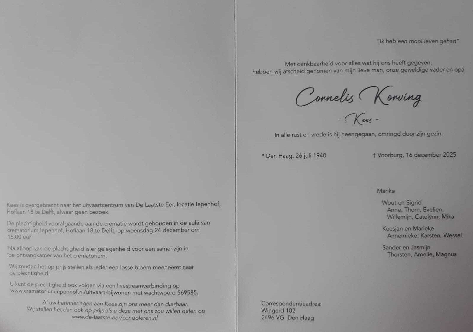 Geïnteresseerde leden kunnen de plechtigheid morgen, woensdag 24 december om 15:00, online volgen. Zie de bijgaande rouwkaart.