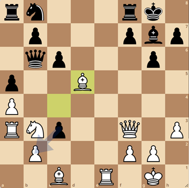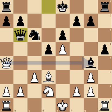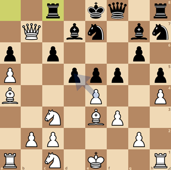 En aan de andere kant naast mij speelde Abel (5), die ook een mooie pot afleverde. Gezien het tijdsverbruik kende Abel de opening een stuk beter dan Djezz Kanbier (1844), en na zet 13…Db6 kwamen we in onderstaande stelling terecht.