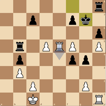 44. Ke3 is natuurlijk verplicht hier, maar gespeeld werd 44. Txgb7??, waarna het meteen uit is na 44..d2. Wit kan niet meer voorkomen dat zwart een dame haalt.