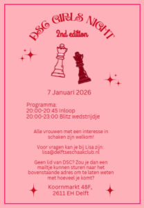 Op woensdag 7 januari vindt bij ons het 2e DSC Girls Night Chess Event plaats.
